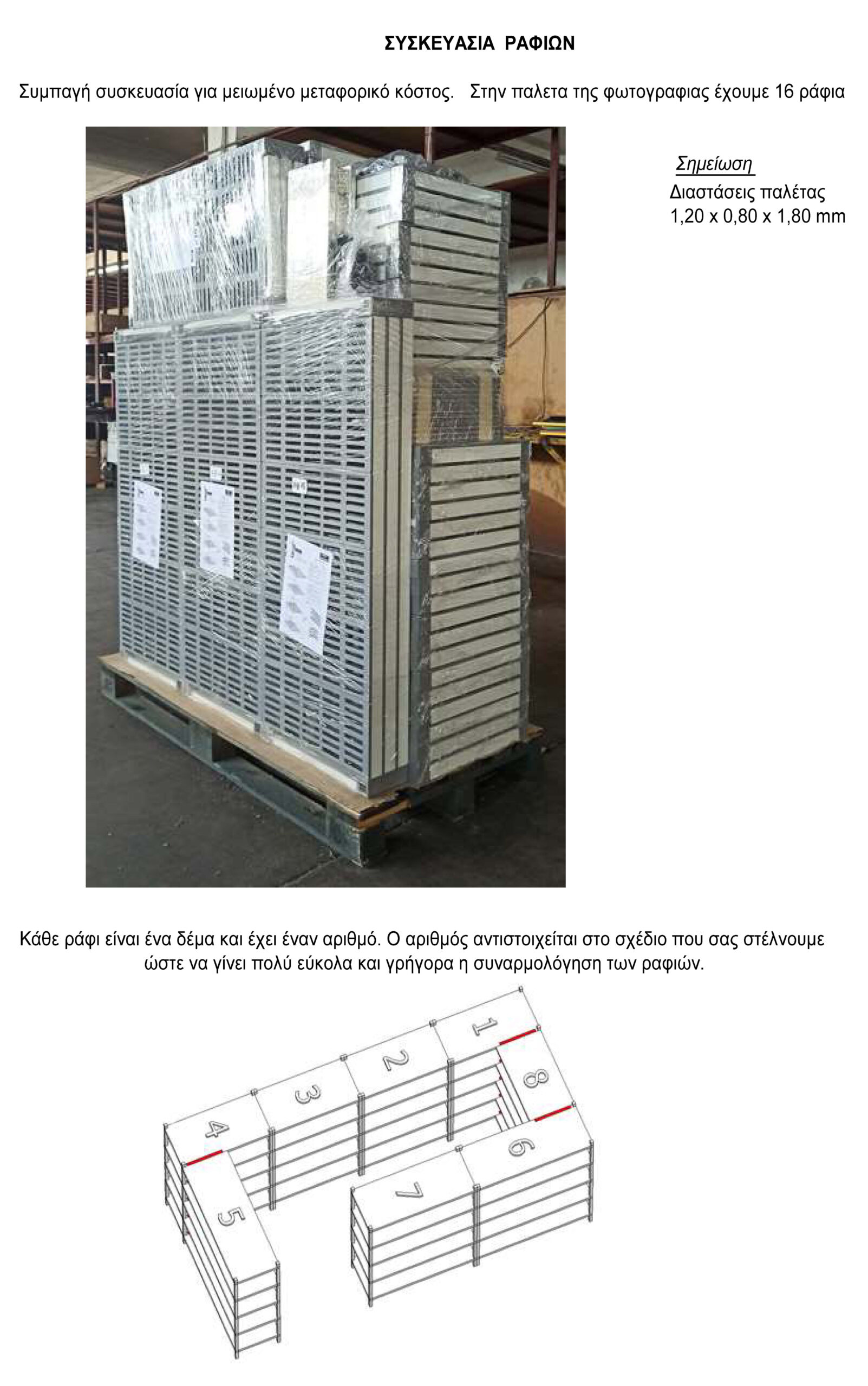 Σε μία παλέτα 1200x800mm μπορούμε να τοποθετήσουμε 16 ράφια με όλα τα απαραίτητα εξαρτήματα. Αυτό μειώνει πολύ το μεταφορικό κόστος.